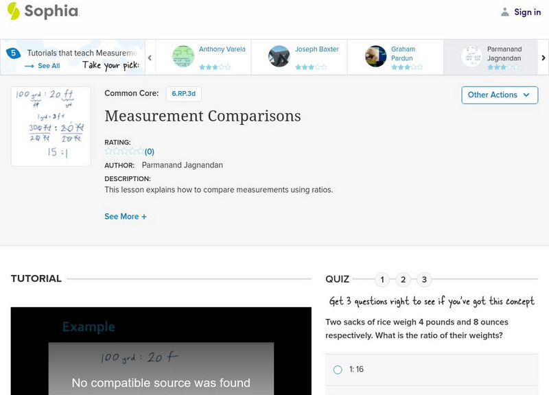 This lesson demonstrates how to simplify ratios containing measurements. Students can watch a video tutorial and then take an online quiz.