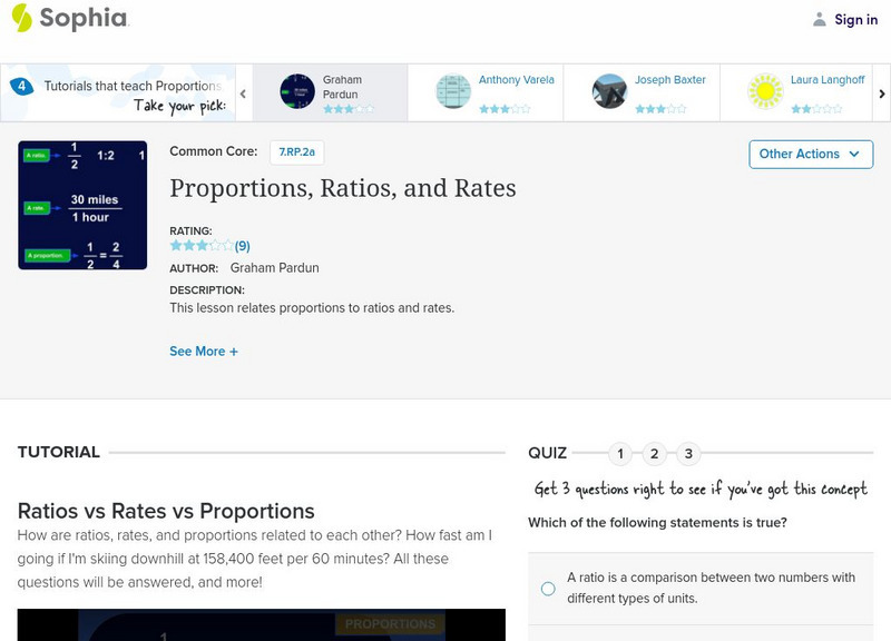 This video lesson describes how ratios are related to rates and proportions. Students can check their understanding with an assessment.