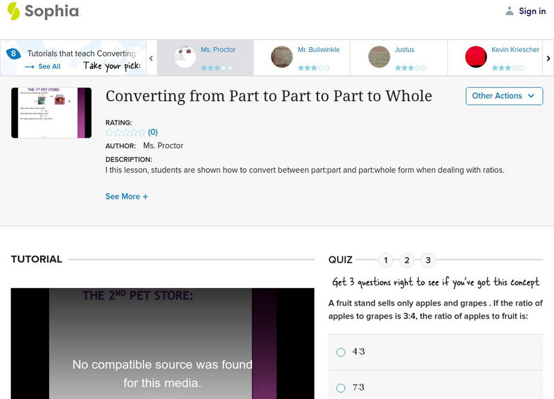 In this lesson [3:47], students are shown how to convert between part:part and part:whole form when dealing with ratios. It is 2 of 14 in the series titled "Converting from Part to Part to Part to Whole."