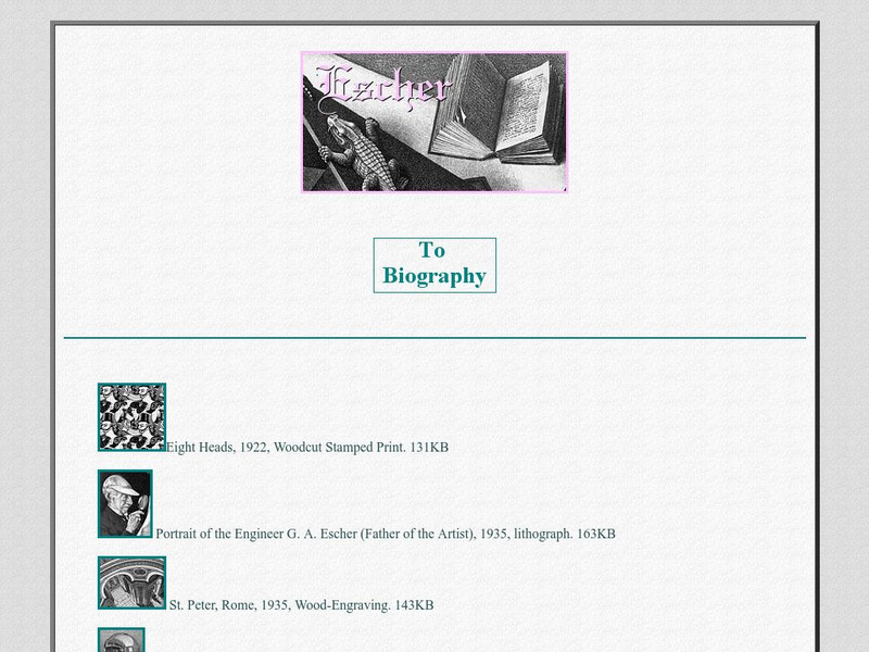 This resource provides a very informative biography as well as a gallery with 15 pictures of great Escher art.