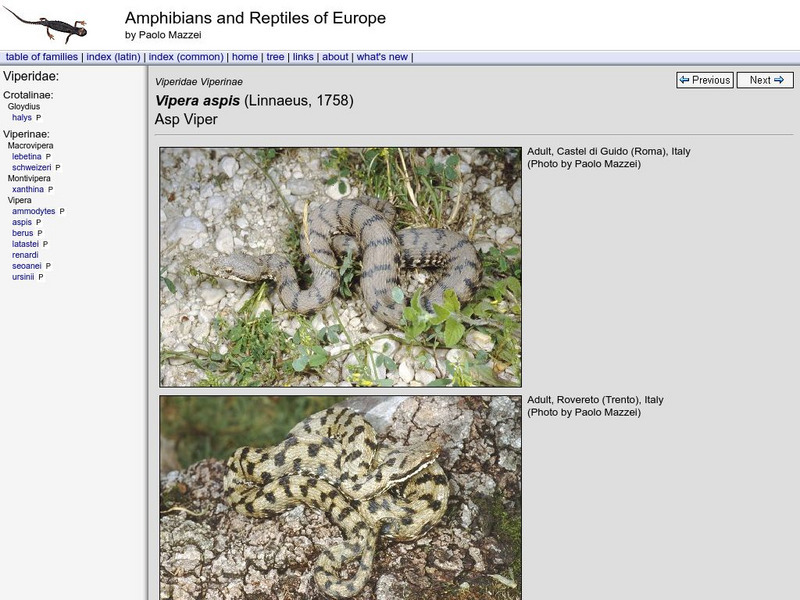 A series of color photos of the Asp Viper from Amphibians and Reptiles of Europe. Link to related species photos.