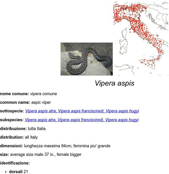 Distributed throughout Europe, the Vipera aspis, is a venomous snake that preys mostly on rodents and lizards. Distribution map of Italy, pictures, and dimensions are included.