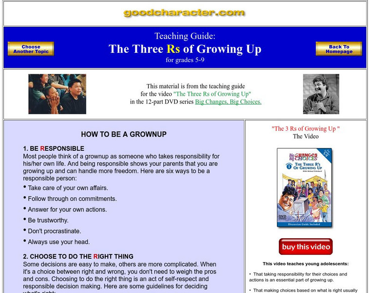 Learn about the "3 R's of Growing Up:" responsibility, doing the right thing, and respecting yourself. This website lists several ways in which you can fullfil the "3 R's" as well as questions for discussion, writing prompts,...