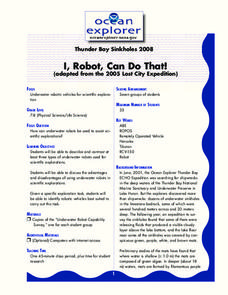 Students describe the three types of underwater robots and the advantages and disadvantages of using them. In this underwater lesson students are given a task and identify the best robot for the job.