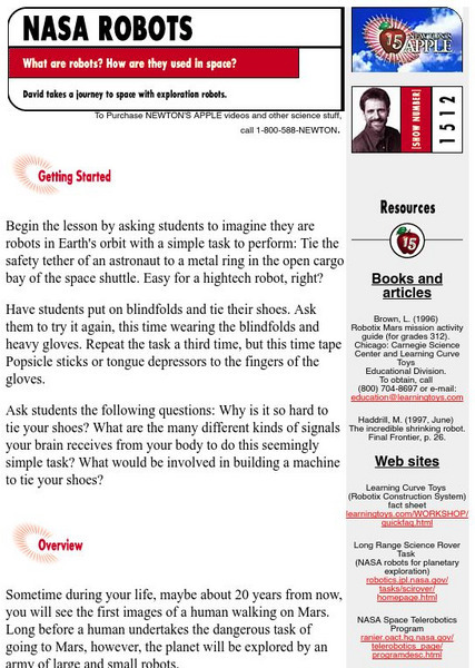 During this lesson students learn the history of robotics in space exploration. They use their creativity to develop a robot. They learn about different career opportunities by communicating with robot specialists at the Johnson Space...