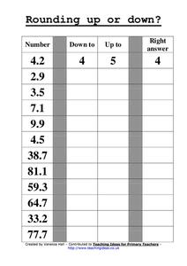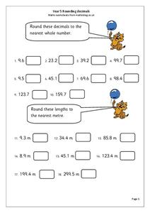 In this rounding worksheet, students solve 10 problems in which decimals to the tenths place are rounded to the nearest whole number. Students then round 18 decimal numbers to the nearest meter.