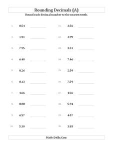 In this rounding decimals activity, students study the given decimal numbers and round the numbers to the nearest tenth. Students solve sixty problems.