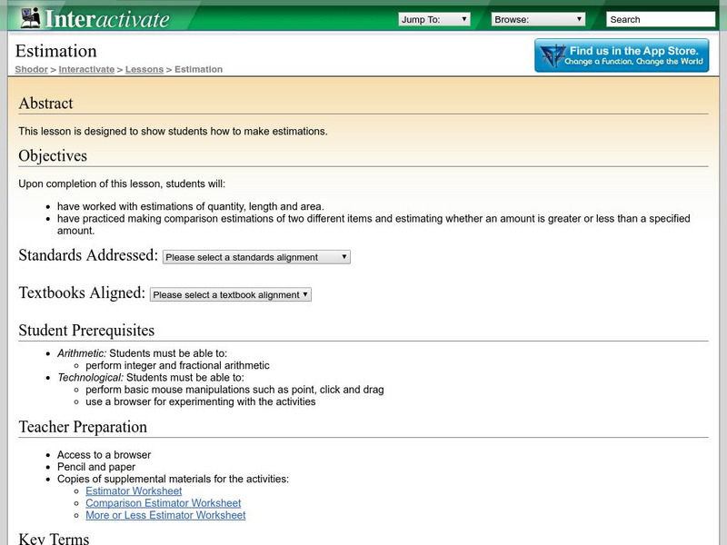 This lesson plan is designed to help students learn to make estimates. Resources are linked to help support the teacher and offer exploration and practice to students.