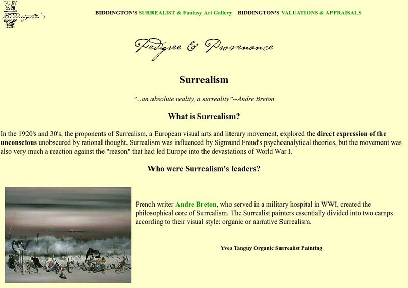 Jake Biddington's resource with art terminology definitions, an art gallery, and more! This page is a biography on surrealism and has hyper-links to artists and images.