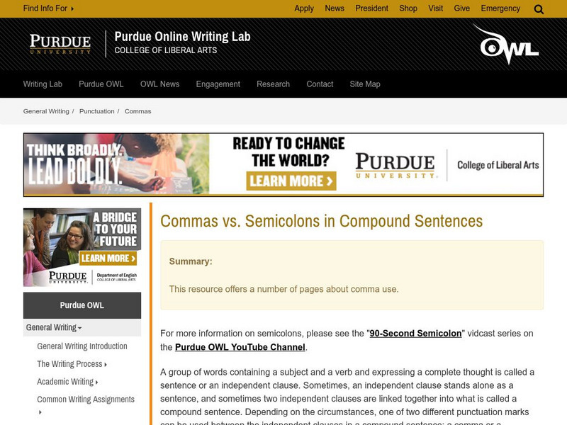 Purdue University Owl: Commas vs. Semicolons in Compound Sentences