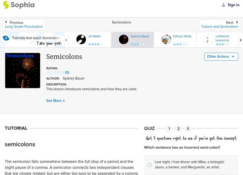 This lesson introduces semicolons, discusses how they are used, and provides a semicolon quiz. It is 10 of 10 in the series titled "Semicolons."