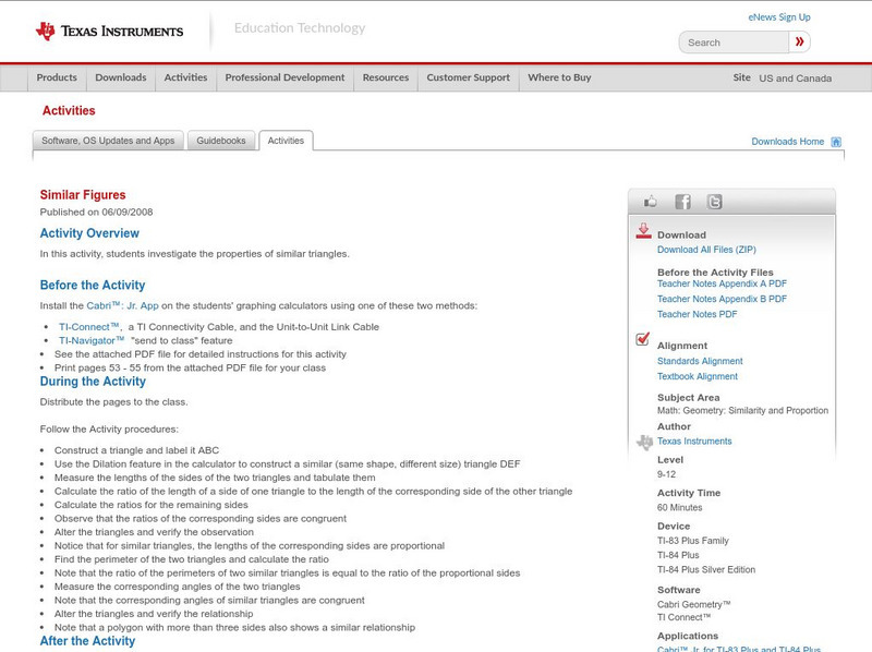Students can use Cabri Jr. to discover two properties of similar triangles: corresponding angles are congruent and corresponding sides are proportional.