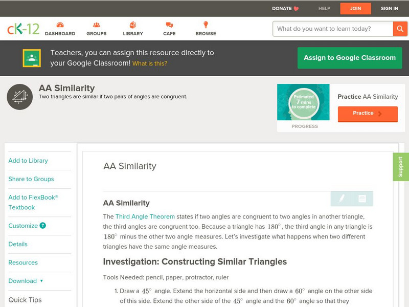 [Free Registration/Login may be required to access all resource tools.] This concept teaches students how to identify whether or not two triangles are similar using AA Similarity.