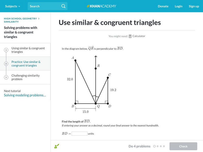 Solve geometry problems with various triangles by using all you know about similarity and congruence. Students receive immediate feedback and have the opportunity to try questions repeatedly, watch a video or receive hints.
