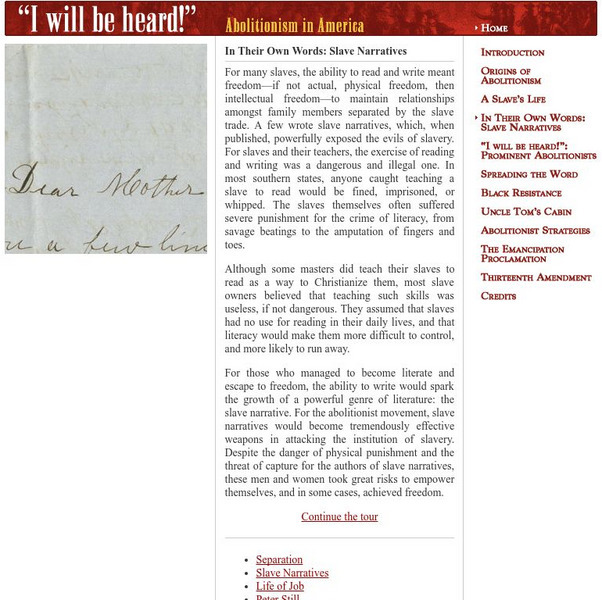 Slaves were not permitted to learn to read and write. Many risked their lives to record the narratives of their experiences as slaves. See why these narratives were so important to the anti-slavery movement. Find links to documents and...