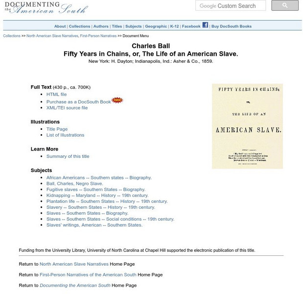 Here, read the entire text to "Fifty Years in Chains; or, The Life of an American Slave," which was written by Charles Ball and originally published in 1859.