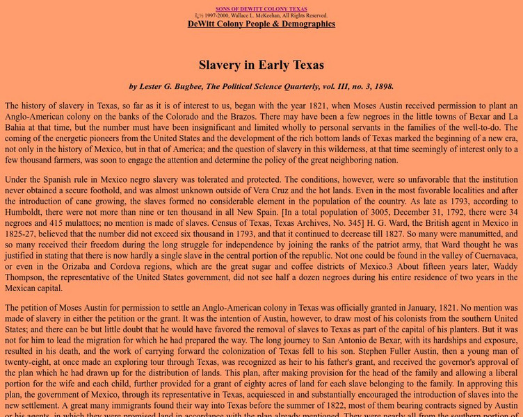 Sons of De Witt Colony Texas: Slavery in Early Texas