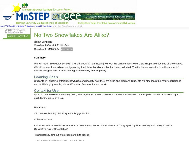 While reading "Snowflake Bentley", learners will observe different snowflakes and identify how they are alike and different in their shape and design. They will then research snowflake designs and create original snowflakes using designs...
