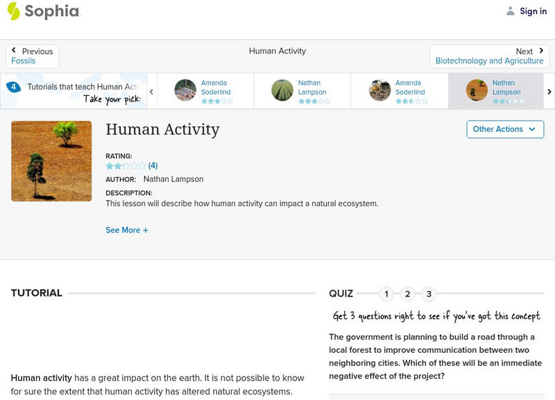 A webpage discussing how human activity has impacted soil, populations, water composition, and temperature. Website includes an audio tour of the material. [1:53]