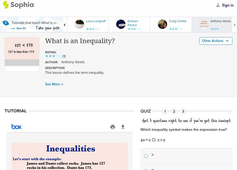 The tutorial discusses how to solve inequalities. Learners explore the concept through notes and examples. Practice problems are included to check for comprehension of the algebra topic.