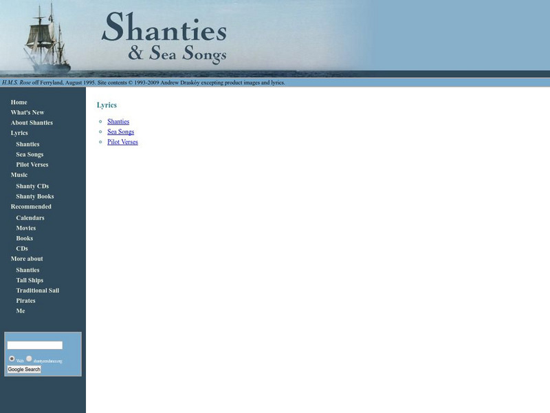 Find lyrics to numerous sea songs, shanties, and pilot songs.