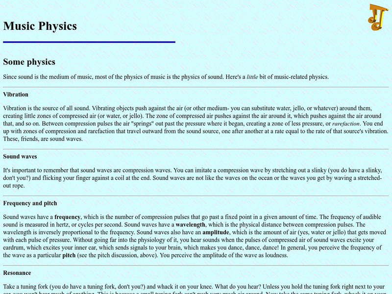 A discussion of a variety of physics topics related to music and sound. Topics include vibrations, sound waves, frequency and pitch, resonance and overtones.