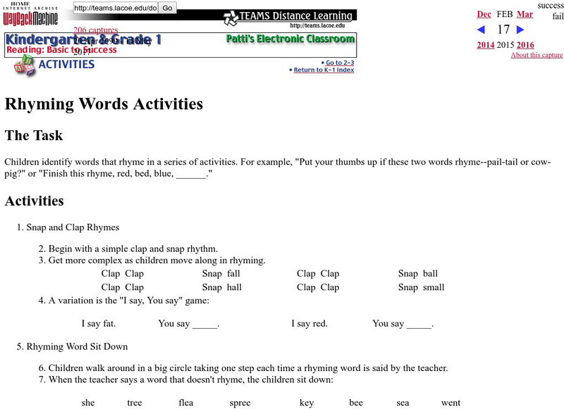 A K-1 lesson plan from TEAMS Distance Learning. "Students will practice rhyming words and also be able to identify words that rhyme. These lessons will have them active."