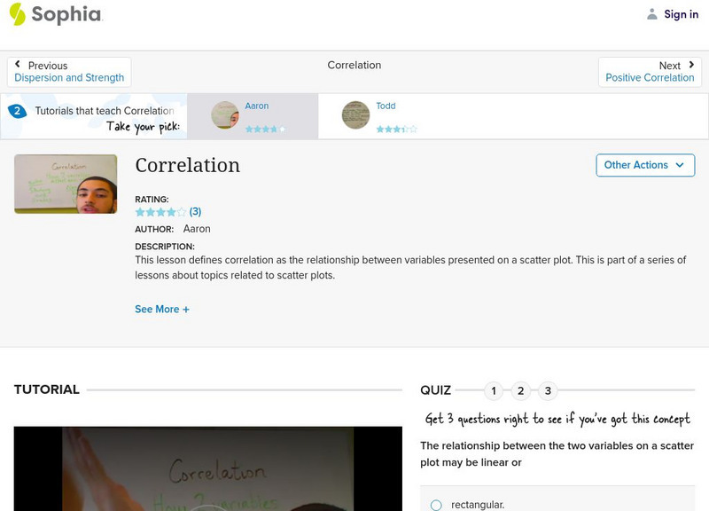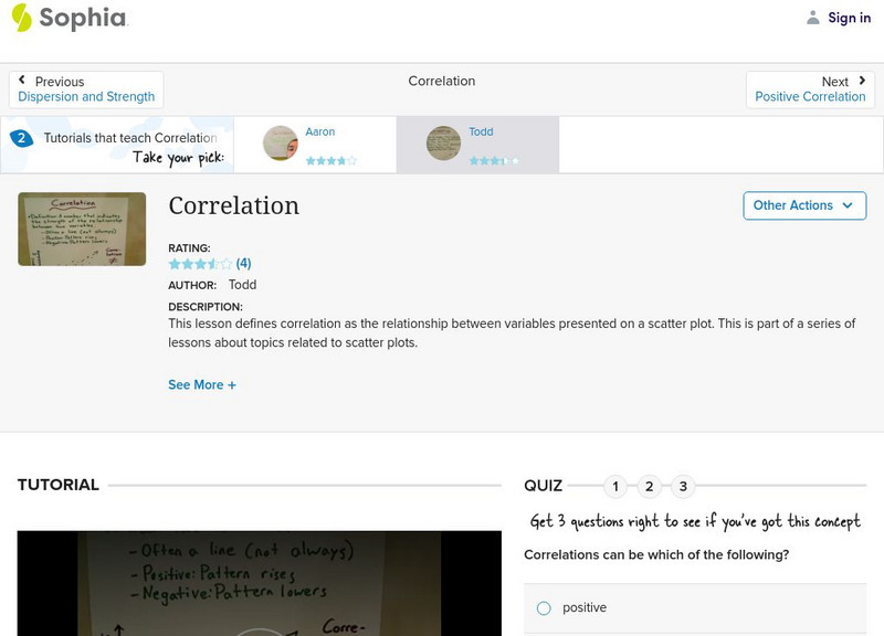 This lesson defines correlation as the relationship between variables presented on a scatter plot. This is part of a series of lessons about topics related to scatter plots. It is 3 of 9 in the series titled "Correlation." [2:04]