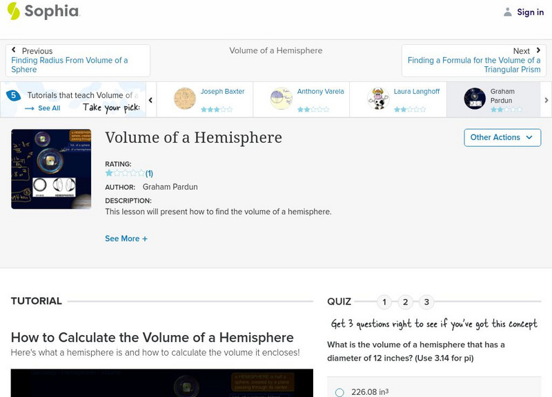 This lesson will present how to find the volume of a hemisphere. Student watch a video tutorial and then can take an online quiz.