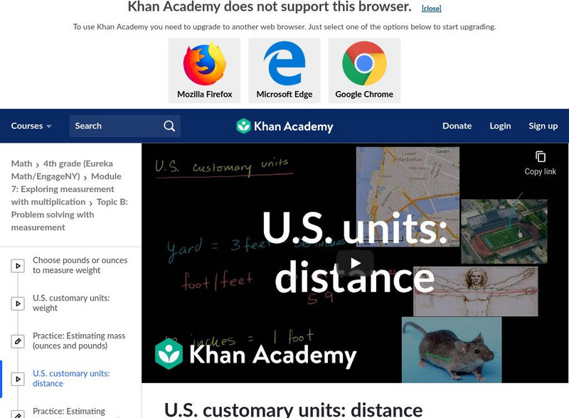 Sal discusses US customary units of length or distance such as inch, foot, and yard. [5:10]