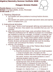 Students use polygons to explore division. They use pattern blocks to represent whole numbers and fractions. They discuss divisors, factors, dividend and products. In groups, students present models and solve problems. They justify their...