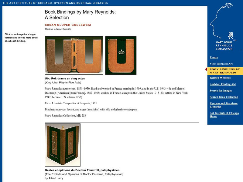 A visual gallery of bookbindings by surrealist artist Mary Reynolds. Much of her work is inspired by Marcel Duchamp and adds an interesting flair to her pieces. You can view information about each piece by clicking on the image.