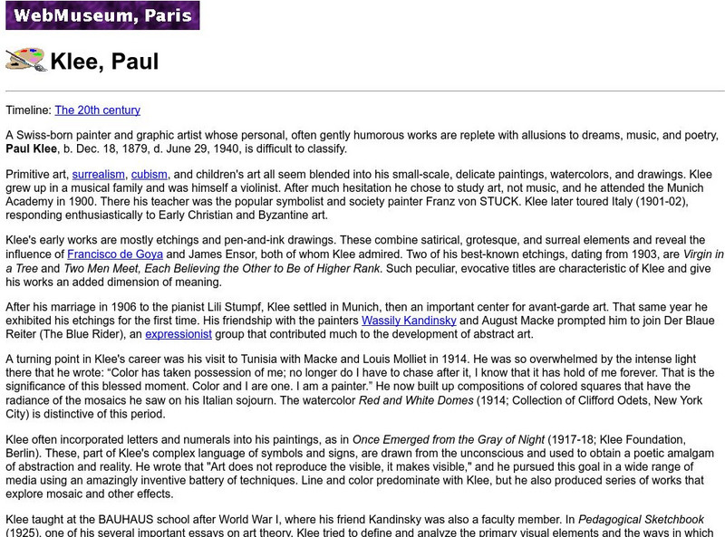 Biography of artist Paul Klee whose paintings combine surrealism, cubism, and abstract styles. Examines "The Golden Fish" and Klee's representation of fear and death in his work. Also features examination of "Ad Parnassum."