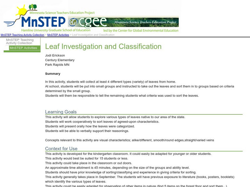 Students will learn about classification of leaves by collecting a variety of leaves from home and working in small groups in the classroom to sort them into groups. Students will present their criteria for grouping the leaves to the class.