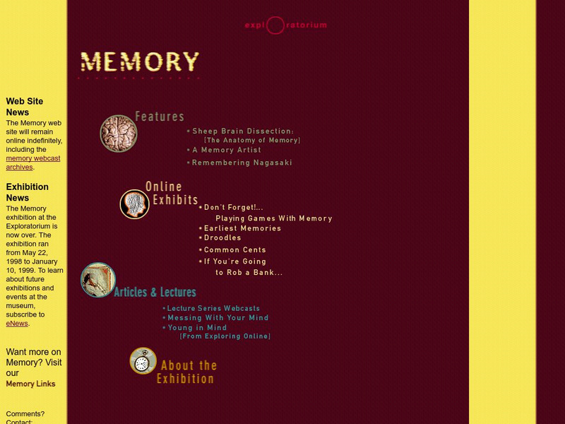 Students investigate the Memory exhibition that was at the Exploratorium. Some topics examined are the anatomy of memory, Nagasaki, and Franco Magnani. The resource consists of exhibition news, online exhibits, articles, and lectures.
