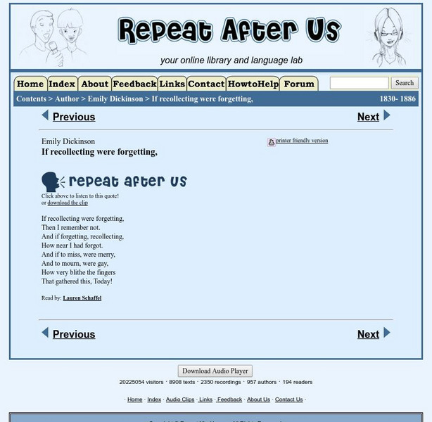 A poem from Emily Dickinson, "If Recollecting were Forgetting", is provided on this site. Students may listen to this poem read aloud by Lauren Schaffel and can access a printable version of this piece.
