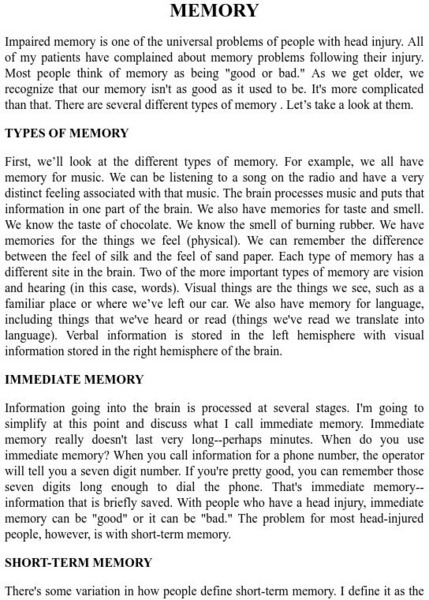 A site devoted to information for those who have suffered traumatic brain injuries, delves into the brains memory functions.
