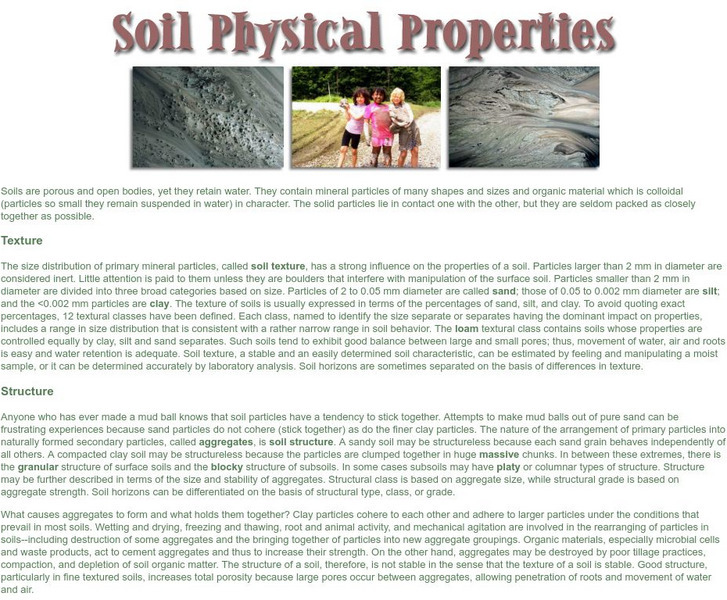 Descriptive site provides details on the physical properties of soil. Contains a brief description on soil texture as well as structure, consistence and color.