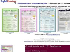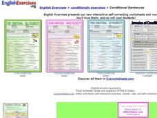 In this online interactive grammar skills worksheet, students answer 22 fill in the blank questions regarding the use of conditionals. Students may submit their answers to be scored.