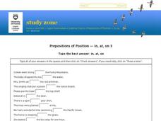 In this prepositions of position worksheet, students note the correct usage of the prepositions in, at, and on. Examples are given for each prepositional phrase.