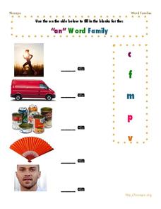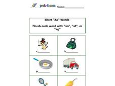 In this short a word families worksheet, students answer 6 fill in the blank questions where they look at a picture and finish each word with the word families an, at, or ag.