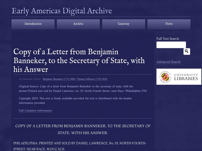 Early Americas Digital Archive: Copy of a Letter From Benjamin Banneker