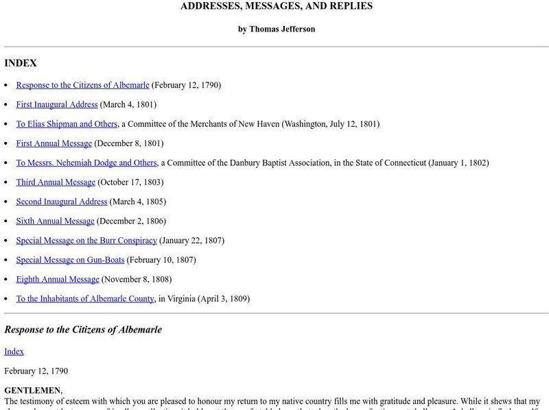 This site provides students access to the full text of selected Thomas Jefferson's speeches.