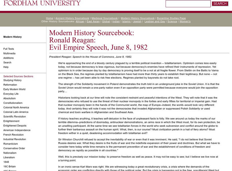 Fordham University: Modern History Sourcebook: Ronald Reagan: Evil Empire Speech, June 8, 1982