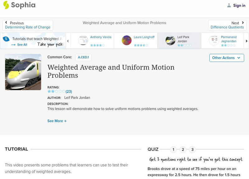 This lesson will demonstrate how to solve uniform motions problems using weighted averages. Students can watch a PowerPoint presentation and then take an online quiz.