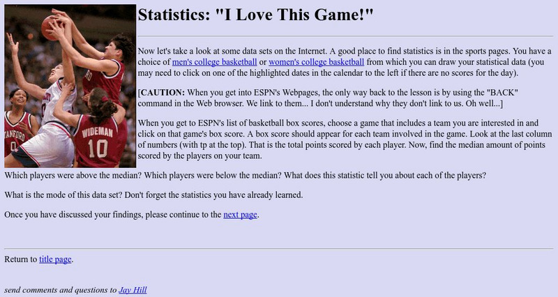 Resource on statistics has a link to ESPN's women's and men's basketball webpages. Students retrieve stats from these pages and practice figuring the median and mode. There are discussion questions included.