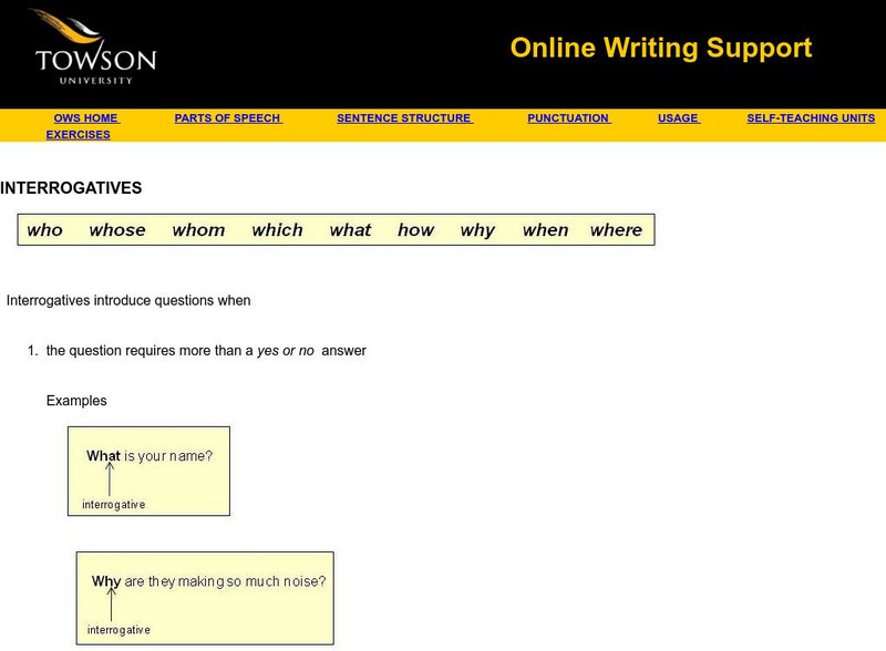 This entry focuses on interrogatives: who, what, when, why, where, which, whom, whose, how. It includes an explanation of their use and examples.
