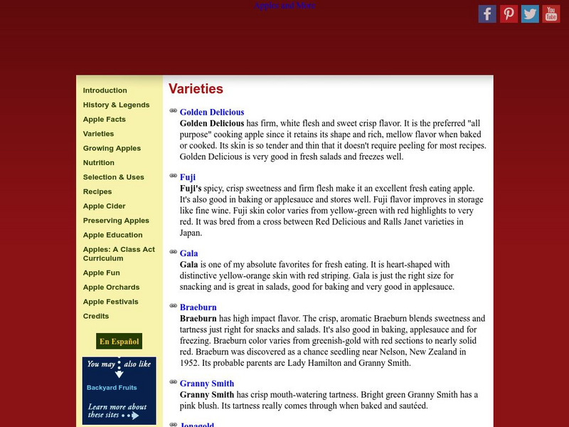 A listing of all the known variety of apples with links to detailed information on and images of each variety. In both English and Spanish.