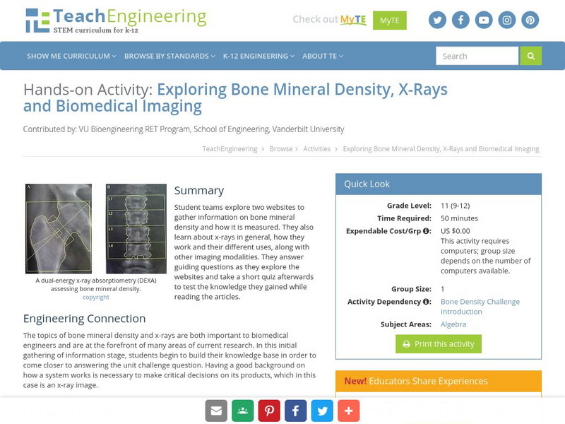 In this activity, students will explore two given websites to gather information on Bone Mineral Density and how it is measured. They will also learn about X-rays in general, how they work and their different uses, along with other...