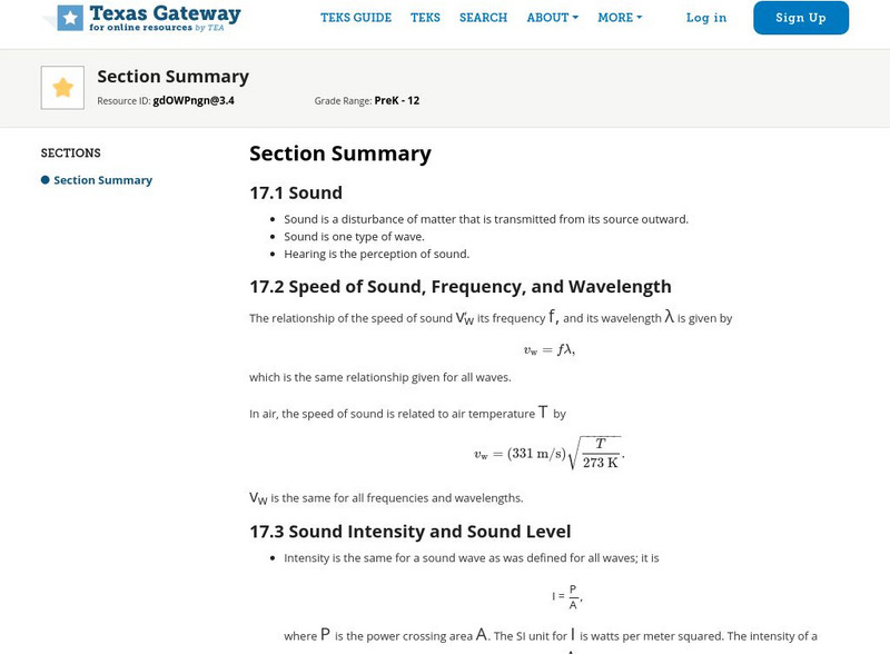 This page provides a summary of the content of each section of Chapter 17: Physics of Hearing from the AP Physics online text.